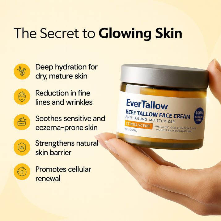Unlock radiant skin with a luxurious cream that combines grass-fed tallow, hyaluronic acid, and frankincense for deep hydration and an anti-aging boost.